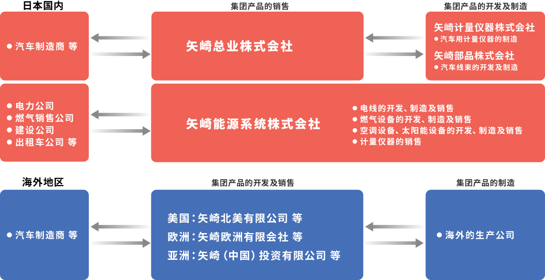 矢崎总业负责人事、财务业务等全面的管理工作,为整个集团的企业运营提供支持。 此外,还从事先进技术的研究开发和产品的营销。